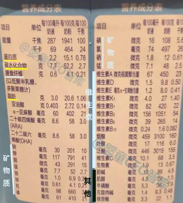 再复习下:国标规定了配方奶粉必需含以下5大营养素:包括蛋白质、脂肪、碳水化合物、维生素、矿物质等。